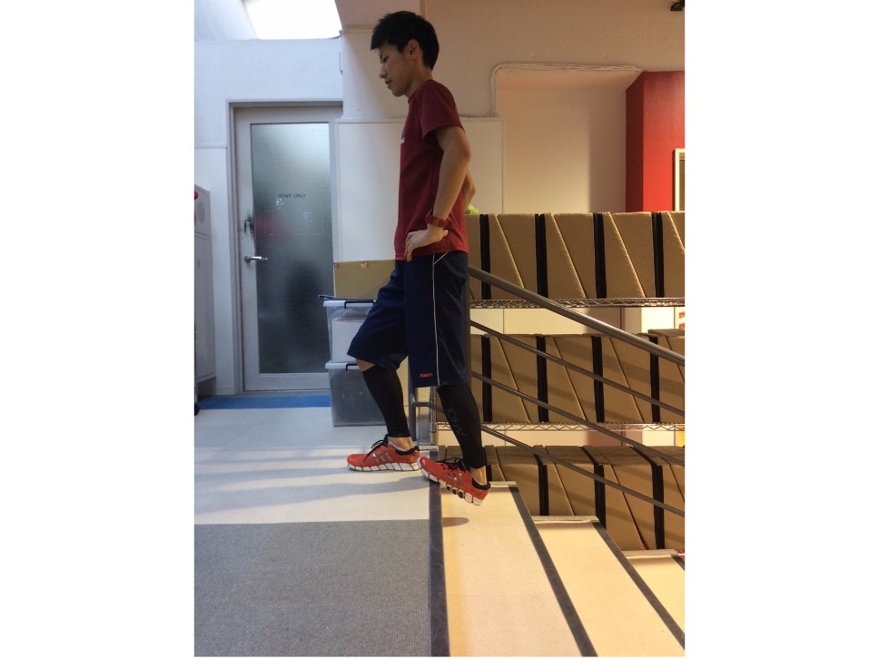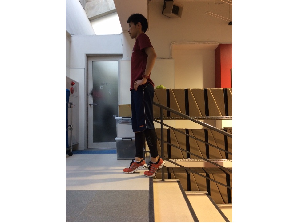 1、動かしたい方のかかとを階段からはみ出します(セット)