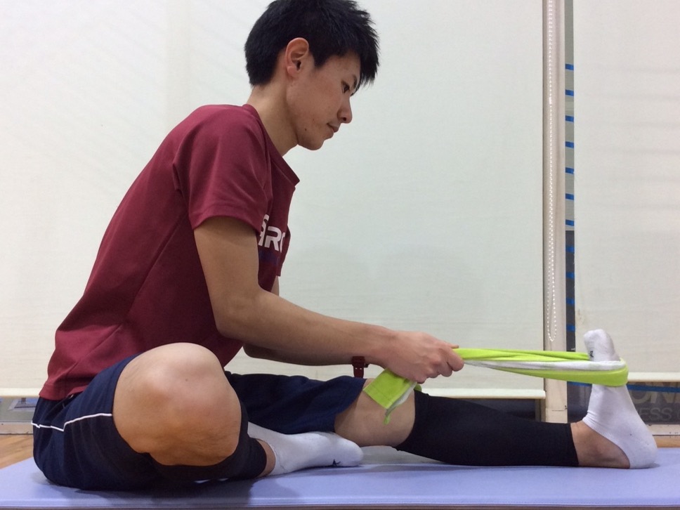 手が足の方に届かなかったり姿勢が窮屈であればタオルを使って引き寄せてください。(右写真)
