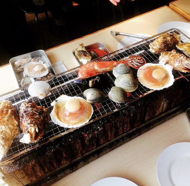 浜焼きは、サザエ、カキ、ホタテ、ハマグリの貝をメインに