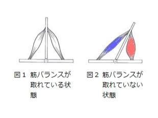 真ん中の柱が骨だとして、 姿勢が悪いのは図2ですよね。硬い方向に引っ張られます。または緩い方向には倒れてしまいます。これがよく言われ歪みですね!