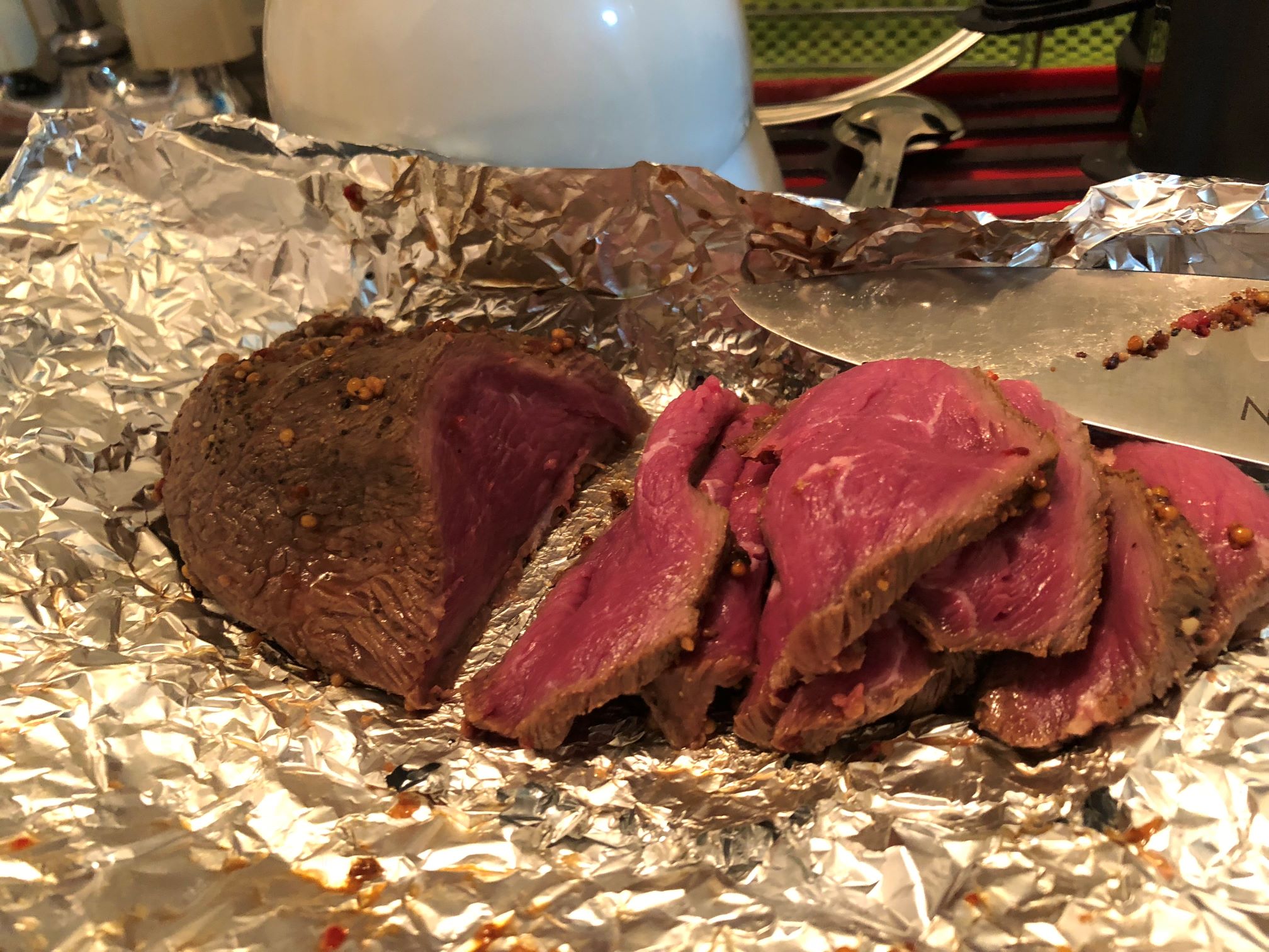 ①塩、こしょう、お好みのスパイスを牛モモブロックに味付けします。