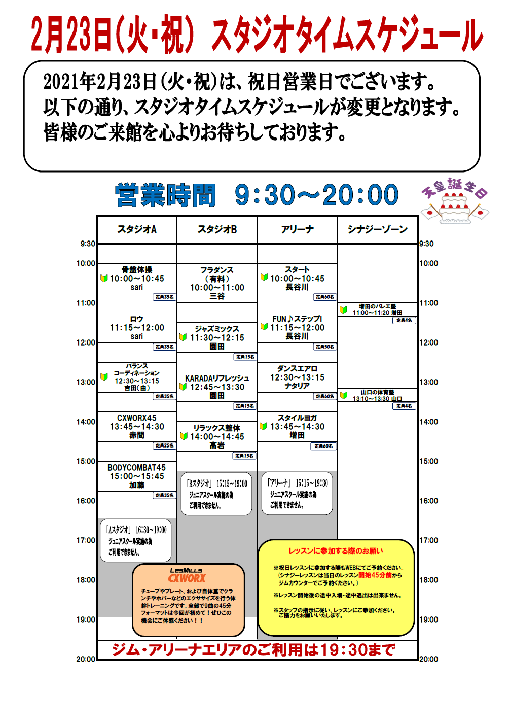 さて、本日は2月23日(火・祝)のタイムスケジュールを