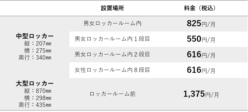 | ロッカーキー紛失 | ロッカーキーを紛失した場合には、フロントまでご申告ください。 再製料 2,200円(税込) |