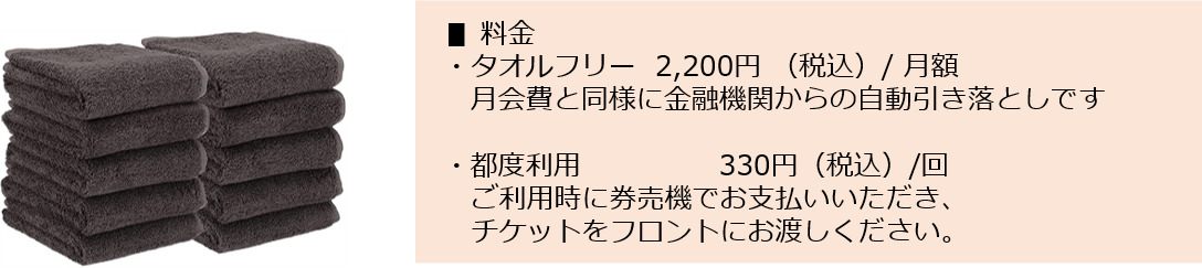 | 料 金 | フィットネスクラブご利用時は4時間まで無料、以降30分毎100円(税込) | |