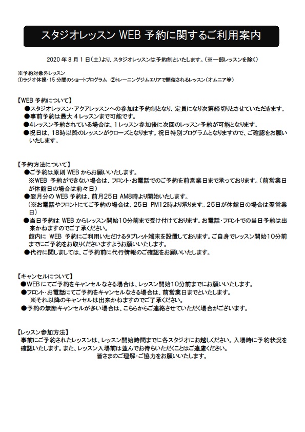 この度、2020年8月1日(土)よりフィットネスクラブ「スタジオレッスン」の参加につきまして、WEB等を利用した予約システムを導入いたしますことをご連絡申し上げます。