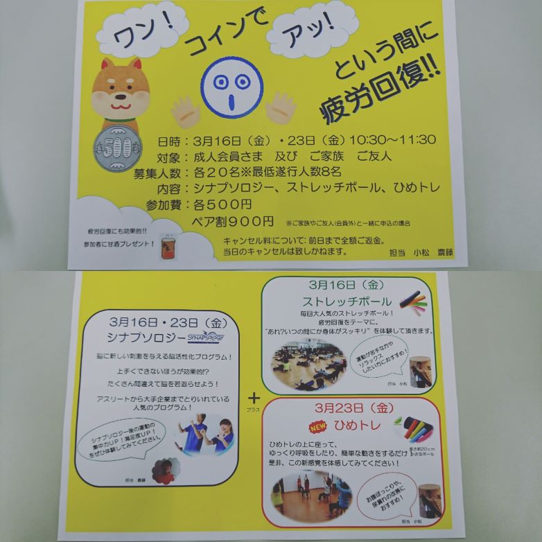 3/23(金)はシナプソロジー×ひめトレ(ぽっこりお腹・産後の尿漏れの改善にオススメ)