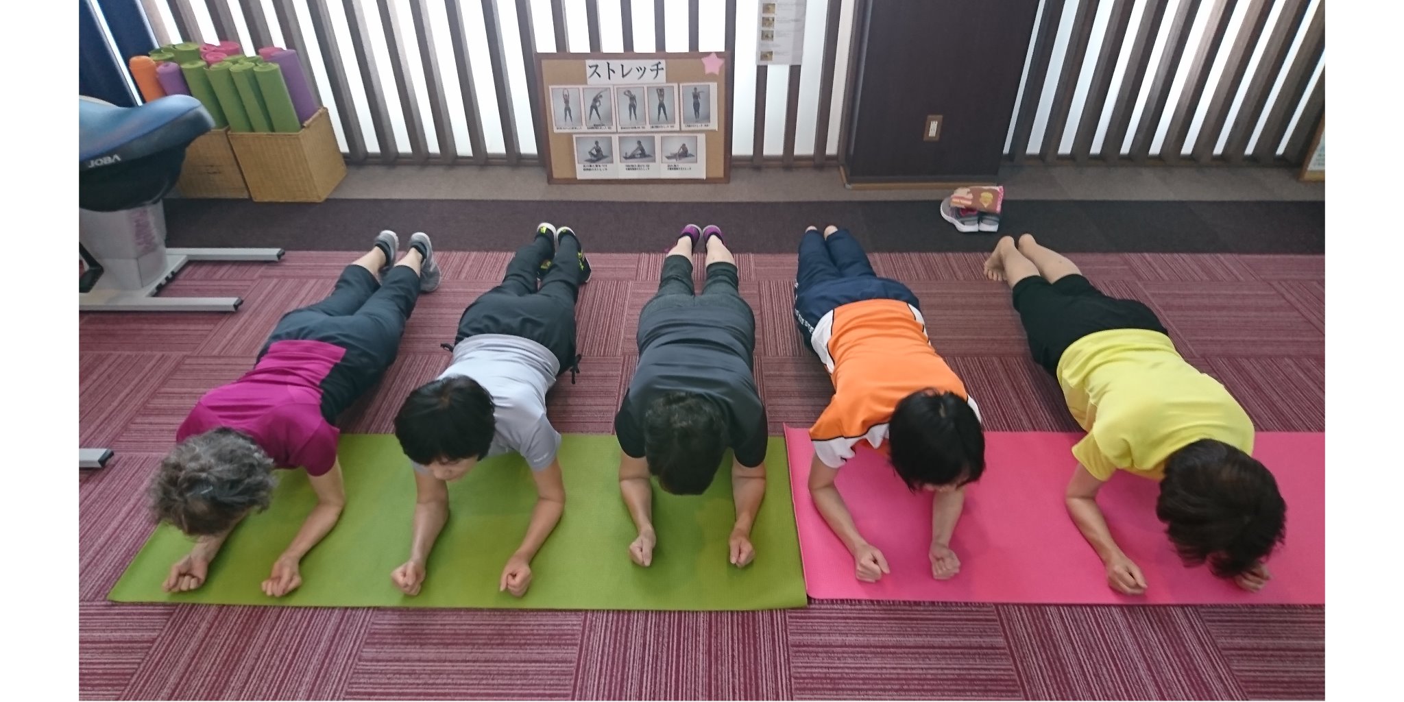 シェイプサーキットのメインは、マシンを使ったサーキットトレーニングですが、室内の半分ほどのスペースはみなさまがストレッチをしたり、写真のような自重トレーニングをしたりするスペースがあります。