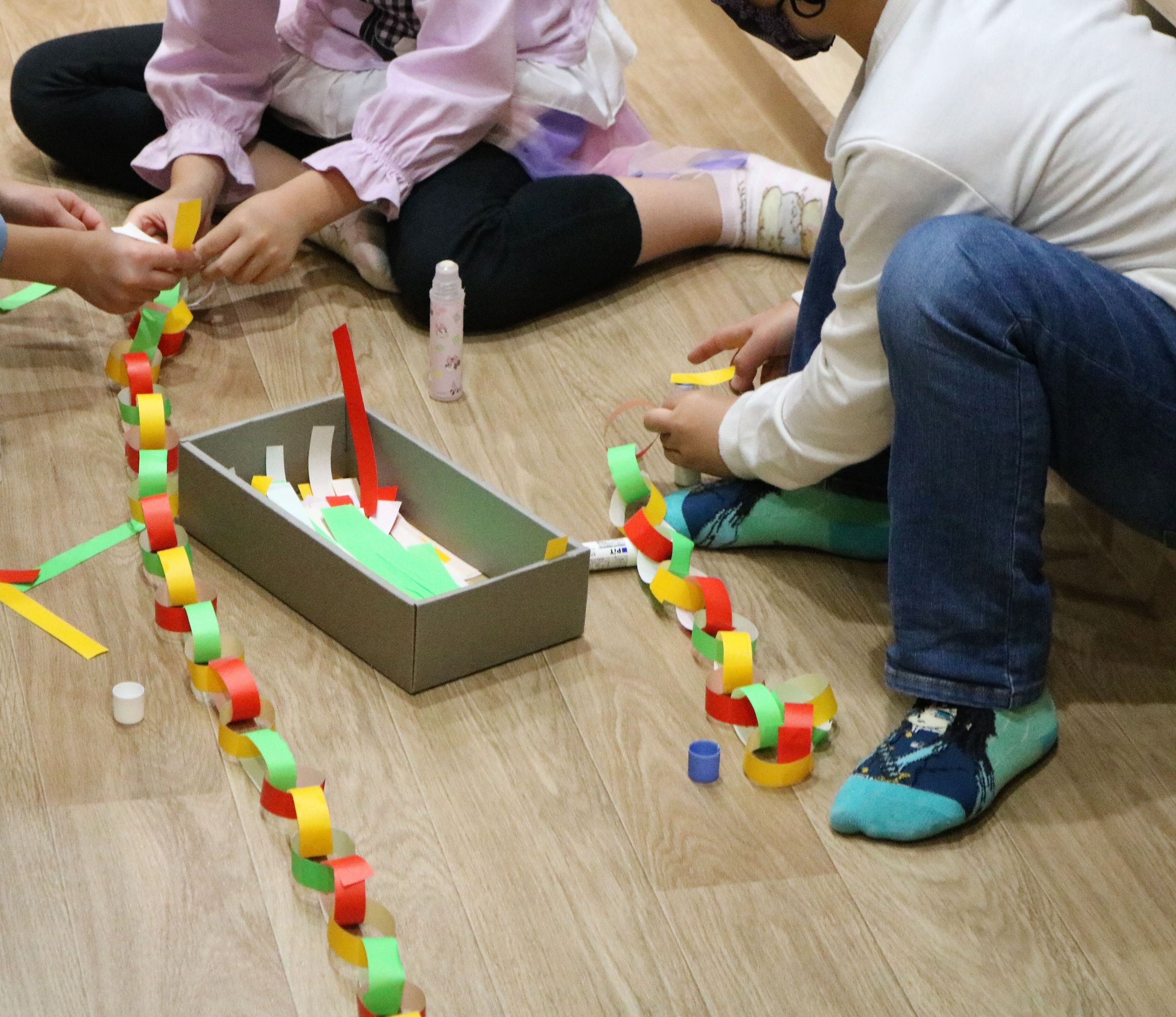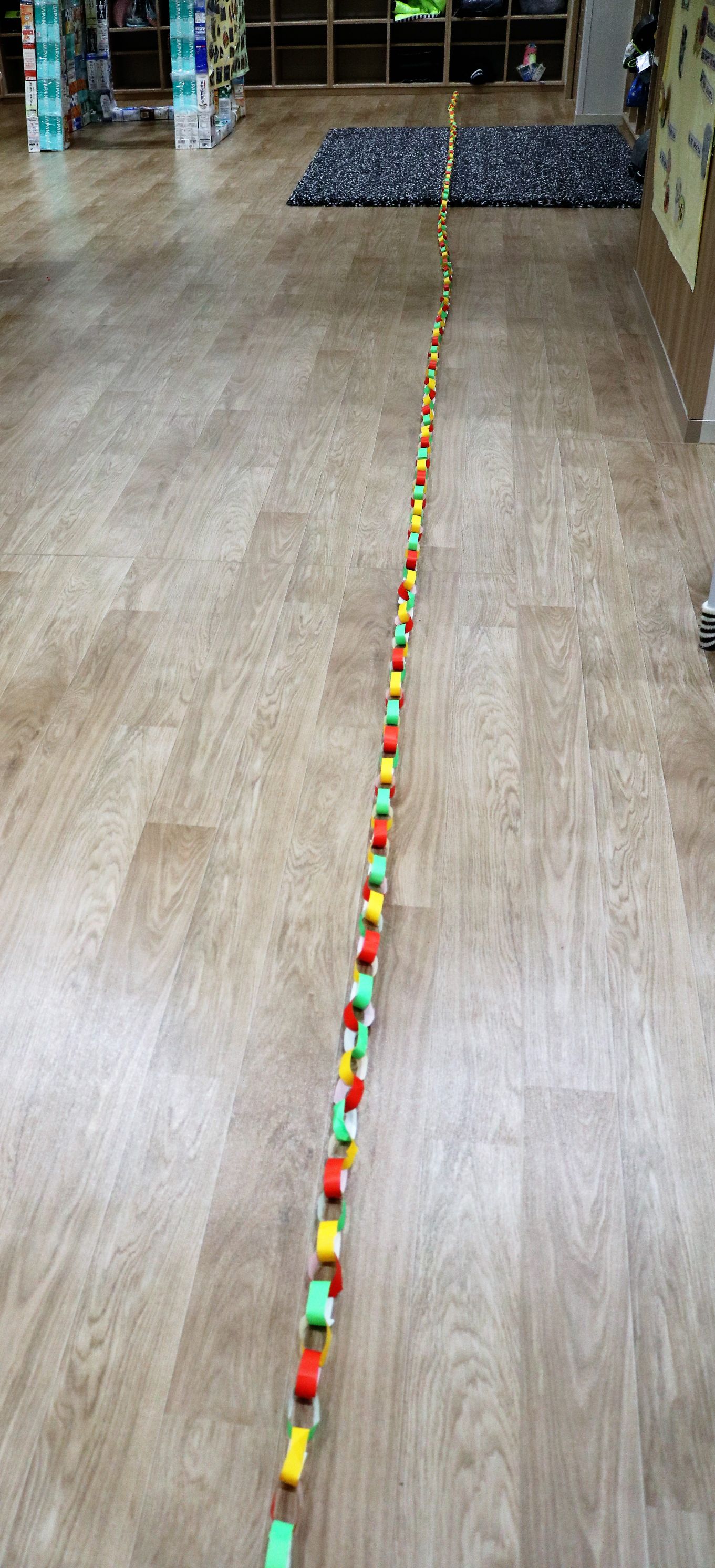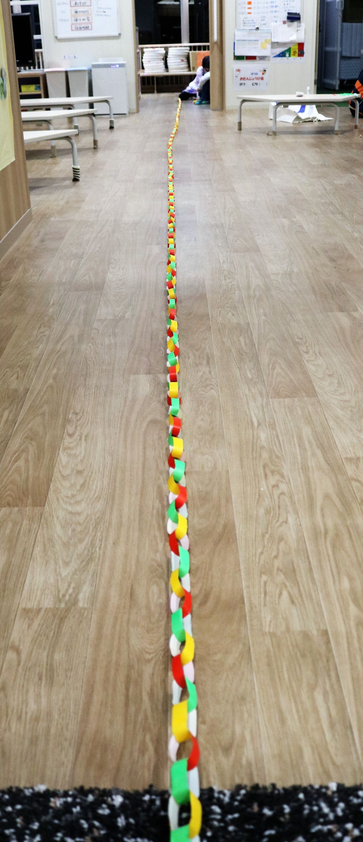 足りなくなれば、折り紙を切る子もいて、みんなで協力しあってどんどん繋がれ…