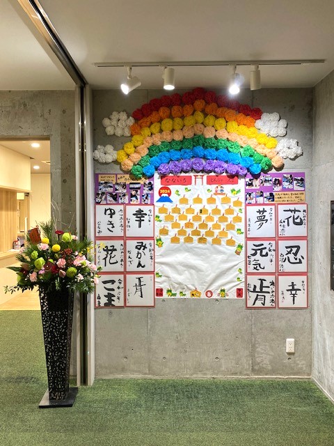 5階エレベーター横の壁にみんなの絵馬と書き初めイベントの作品が飾ってあります。