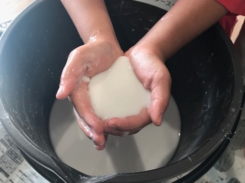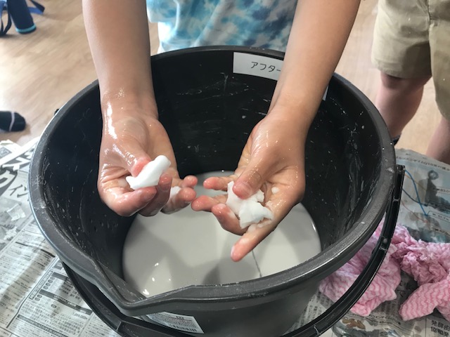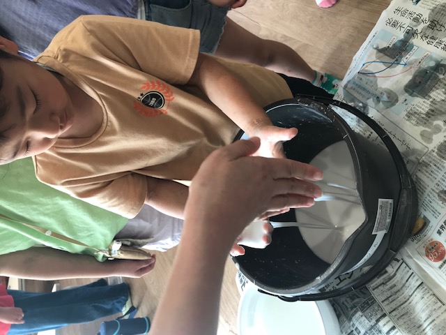 一年生は上手に扱うお兄さんお姉さんをみて、でっかいの作るー!と手にいっぱいの液体をもって握ったりして感触を楽しんでいました(*^^*)