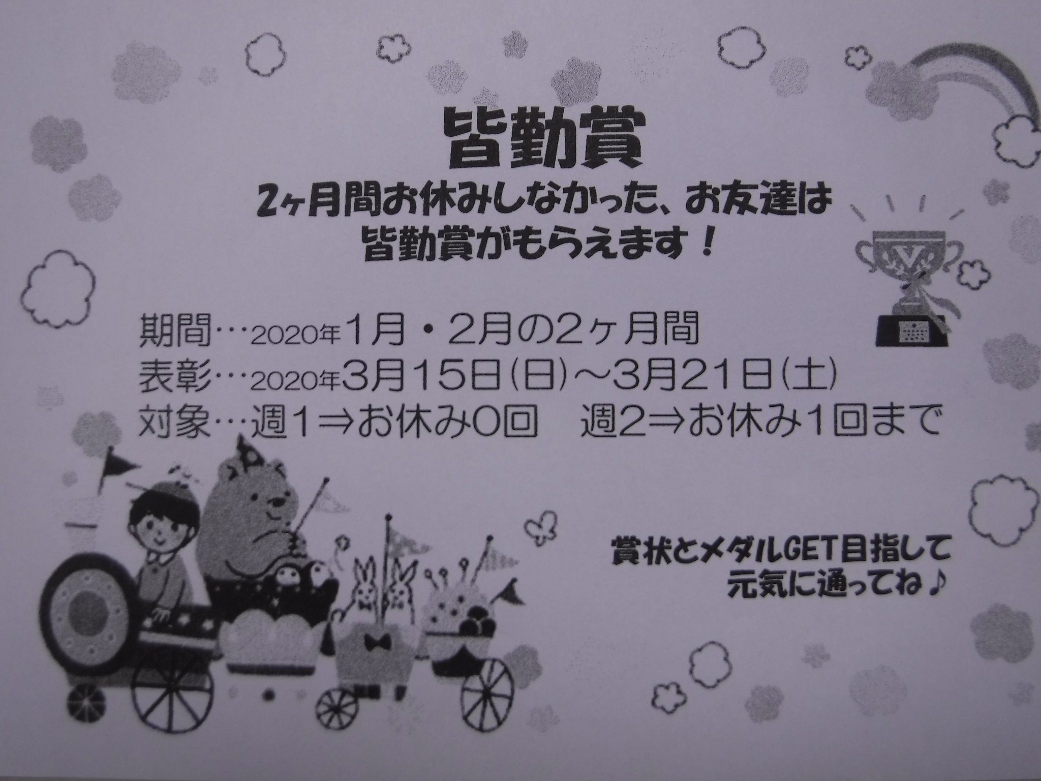 さて、Jコースで1月、2月の2ヶ月間を対象に皆勤賞を行います。