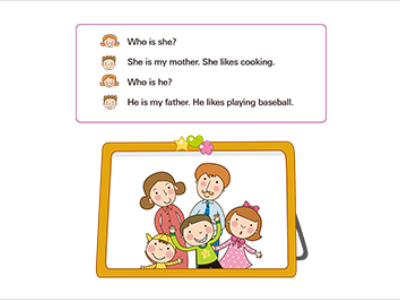 家庭や学校、課外活動など、子どもたちの身近なくらしに関する会話文や、外国の童話などの簡単な読み物を通じて、「聞く」「話す」「読む」「書く」の4技能の総合学習を行います。
