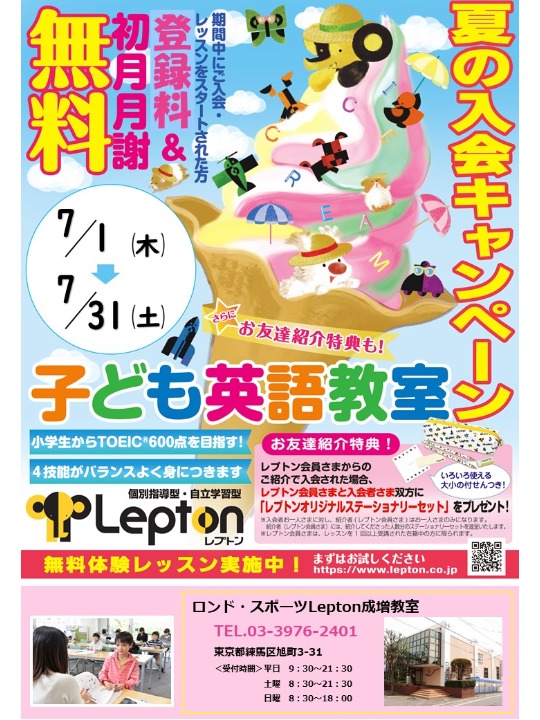 Leptonでは、今年7月、登録料&初月月謝が"無料"になる「夏の入会キャンペーン」を実施いたします。
