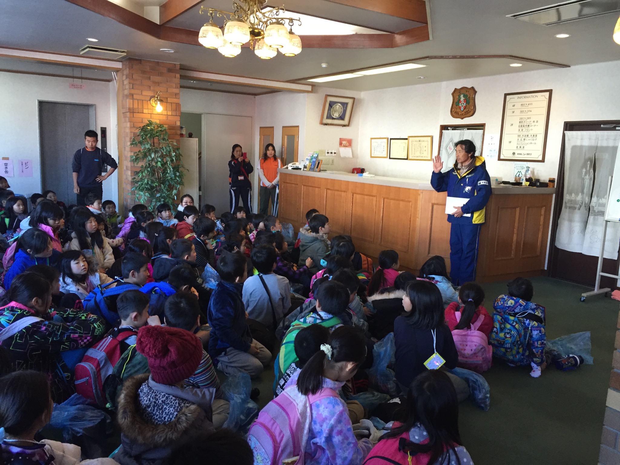 昼ご飯を食べて、帰り支度をして、3日間お世話になったホテルの女将さんとスキー学校の校長先生に、みんなで感謝の気持ちを伝えました。