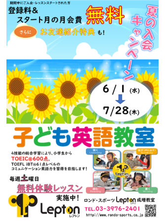 さて、ロンド・スポーツLepton成増教室では7月に予定していた夏の入会キャンペーンを6月に前倒ししてスタートします。