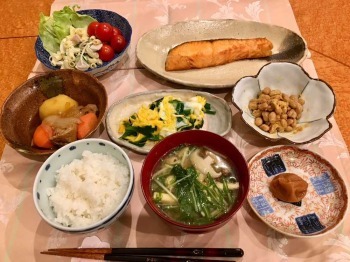 鯖や鮭の塩焼き、卵焼き、白い飯、味噌汁と一緒に納豆。