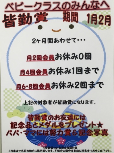 1月と2月の2ヶ月間限定で皆勤賞を行います✨