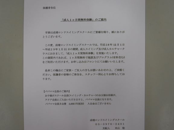 成人クラスの1ヶ月無料体験のお知らせです。