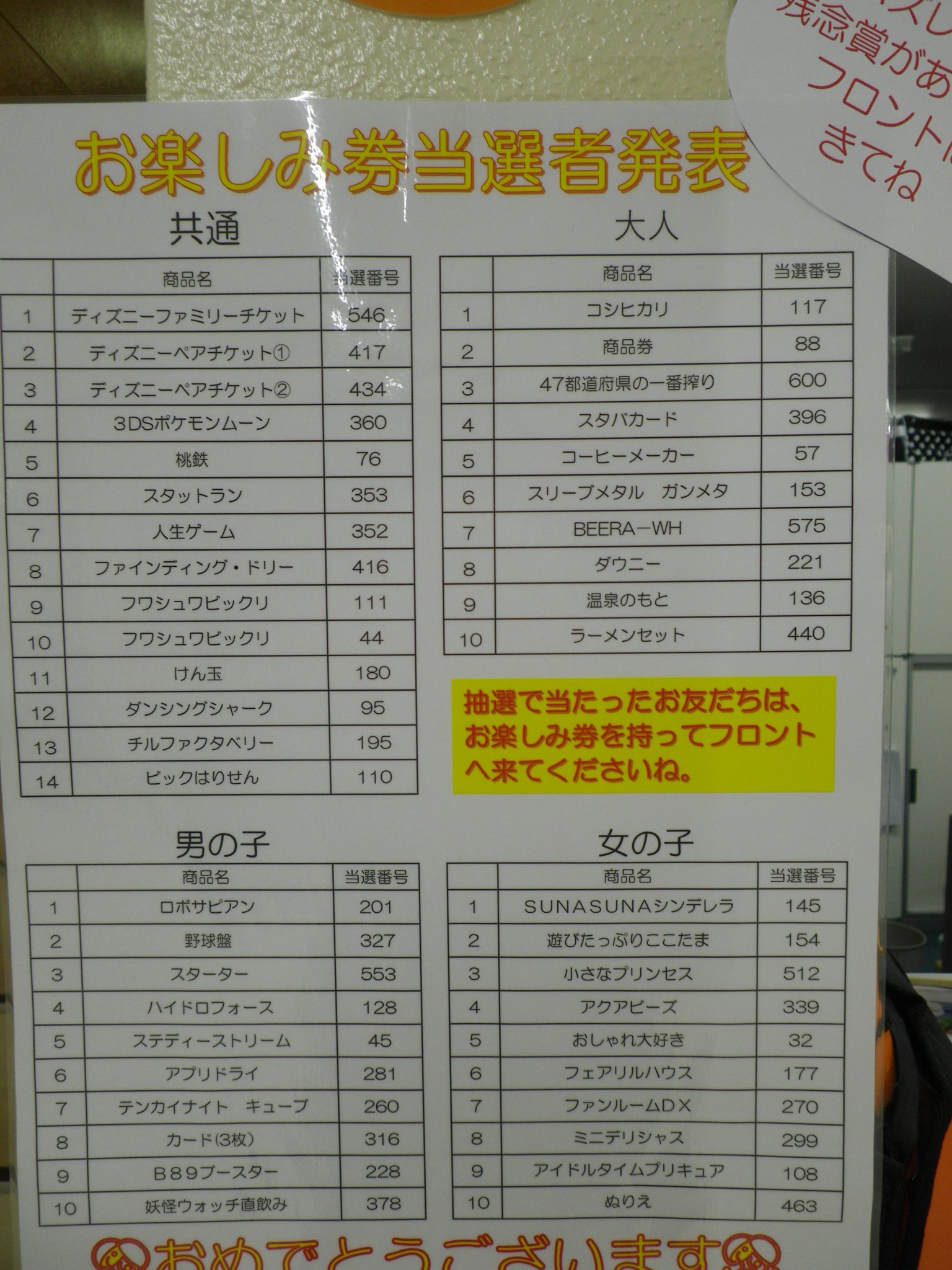 抽選番号はフロントに貼ってあります!!