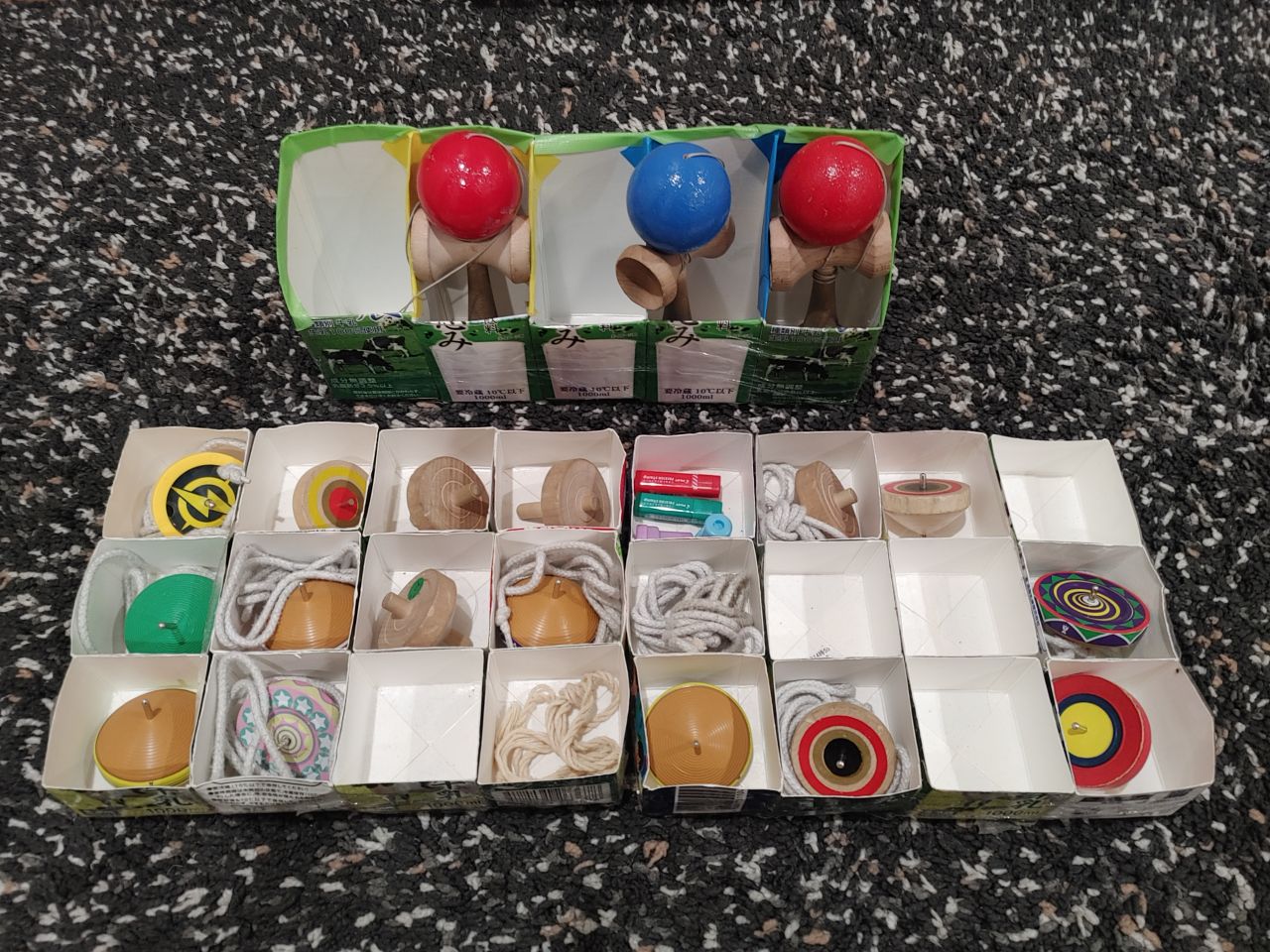 また定番となっている牛乳パック工作では、けん玉やコマの収納にちょうど良い大きさであったため、収納ボックスも作成しました。