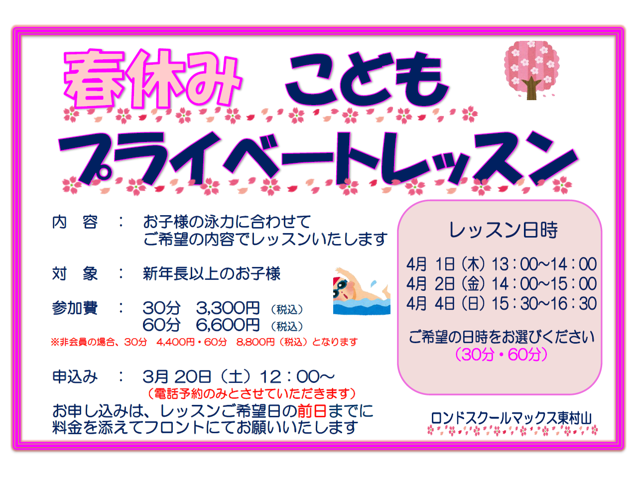 いつもご好評いただいております子どもプライベートレッスンを春休みに実施します!