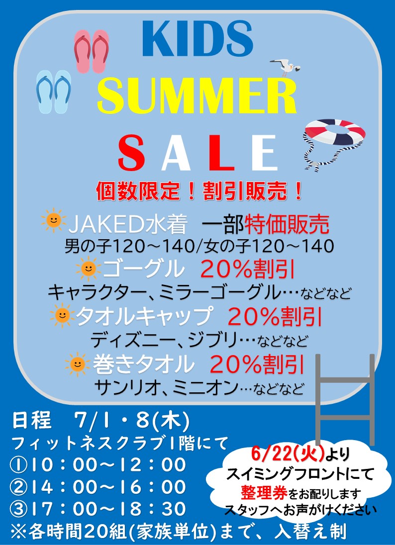 水着の特価販売をはじめゴーグル、タオルキャップもセール販売となります。