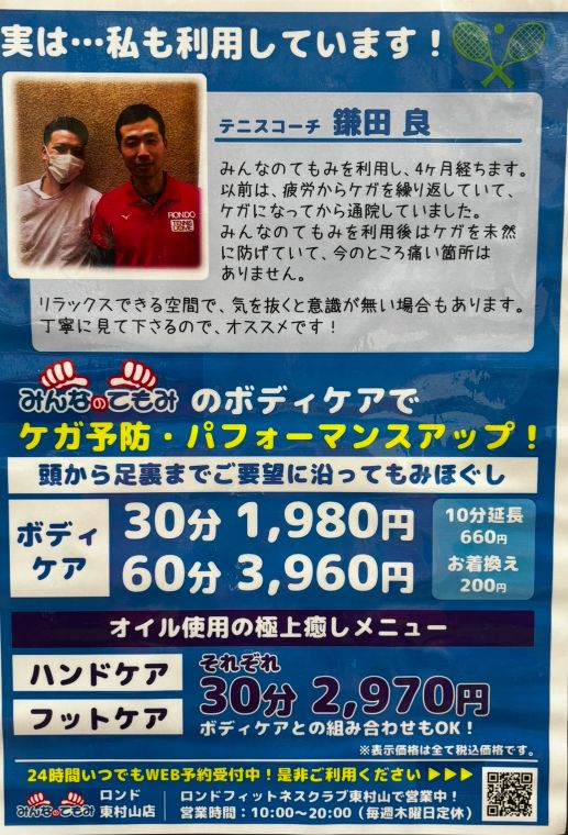 さて…お隣のロンドフィットネスクラブ東村山に『みんなのてもみ』リラクゼーション整体が